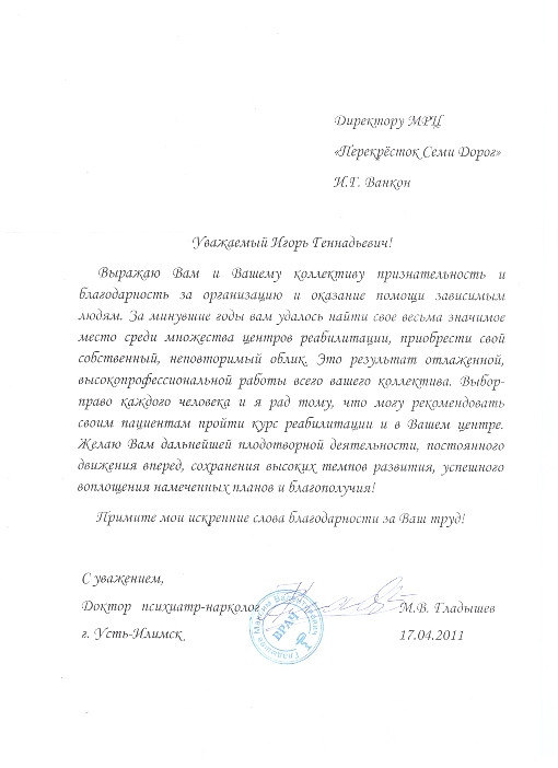 Выражаю вам и вашему коллективу признательность и благодарность за организацию и оказанию помощи зависимым людям. За минувшие годы вам удалось найти свое весьма значимое место среди множества центров реабилитации, приобрести свой собственный, неповторимый облик. Это результат отлаженной, высокопрофессиональной работы всего вашего коллектива. Выбор-право каждого человека и я рад тому, что могу рекомендовать своим пациентам пройти курс реабилитации и в Вашем центре. Желаю вам дальнейшей плодотворной деятельности, постоянного движения вперед, сохранения высоких темпов развития, успешного воплощения намеченных планов и благополучия! Примите мои искренние слова благодарности за Ваш труд!
